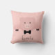 Ein personalisiertes Kissen mit einem zeichn eines niedlichen rosa Schweinegesichts. Von seinen schwarzen Klauenhofen erheben und über einen Tisch pinkeln. Niedlicher und skurriler zeichn. Set auf einem rosa Hintergrund mit verblassten Herzen.