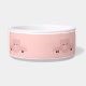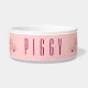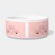 Eine personalisierte Tierschale mit einem zeichn eines niedlichen rosa Schweinegesichts. Von seinen schwarzen Hühnchen erheben und über dich gucken. Niedlicher und skurriler zeichn. Set auf einem rosa Hintergrund mit einigen verblassten Herzen hier und da.