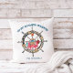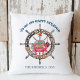 Weihnachten an der Küste, Seeblick-Kissen mit originellen Kunstwerken eines verwitterten Kapitänsrads, das in Strandlampen, Meeresglaskugel und Seesterne-Ornamenten verziert ist, mit einer niedlichen Krabbe mit einem Treibholzschild, das "Frohe Weihnachten" sagt. Gruß sagt "Yo Ho Happy Holidays", und die Rückseite ist klassisch marineblau. Personalisieren Sie mit Ihrem bevorzugten Gruß, Familienname und Jahr.