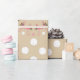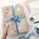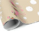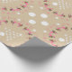 Weihnachtsverpackungspapier an der Küste auf einer Rolle. Die hochwertigen, schweren Geschenkpackungen haben ein einzigartiges Design mit Flamingos, Sand Dollars und Seesterne auf einem sandfarbenen Hintergrund bedruckt. Weihnachtsbaumbilder sind aus weißen Seestern mit einem Sand-Dollar-Basis gemacht. Rosa Flamingos mit festlichen Urlaubskränzen umgeben weiße Seesternbäume mit Sand-Dollar-Basis.