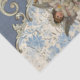 Schönes, Vintages Engelmädchen mit einem warmen, rosa und weiß, Wintermantel mit Flügeln, eine kleine Glocke läuten. Sie spielt Weihnachtsmusik auf Weihnachtsblättern, die teilweise auf einer verzierten Mischung aus blau und weiß verblassten Printen überlagert wird. Verzierte blaue und silberne Ecke oben rechts. Blau-weiße Blumen rechts unten.