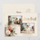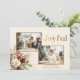 Feierlicher Urlaub Zwei-Foto-Karte Design mit überlappenden Fotos, "Joyful" Gruß in Custom Gold Typografie, und farbenfrohe Ecke Bouquet von Winterkiefer, Rose und Heiligen mit goldenen Glitzern. Zurück bietet ergänzende Blumengrafik und Textblock für Ihren Urlaub Gruß.