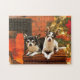 Ein Portrait von zwei Chihuahua vor einem Weihnachtsbaum und einem Feuerplatz. Dieses Foto wurde in einem Studio in Pleasant Valley, NY mit einer Urlaubskulisse (Holländischer Landkreis in der Region Hudson Valley) aufgenommen. Es wurde von Debbie Quick of Debs Creative Images aufgenommen. Weitere Fotografien von Debbie finden Sie auf ihrer Website unter: www.debscreativeimages.com