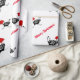 Weihnachtsverpackungspapier wird mit einer Spaßgruppe Schwarzweiss-Hühnern gezeigt, die um tragende laufen [auf die eine oder andere Weise] rote Weihnachtsmannmützen. Gedruckt an über weißem Hintergrund.
