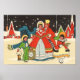 Vintage Abbildung Viktorianisch Frohe Weihnachtsgestaltung mit Familienfahrten in einer kalten Winternacht mit einer niedlichen Kleinstadt im Hintergrund. Dieses malerische Dorf hat Häuser mit Rauch, die die Schornsteine hochkommen, Schnee auf dem Boden und es gibt Sterne am Himmel. Man kann fast die Musik der Stillen Nacht hören. Die Mutter hält das Liedbuch, während der Vater über ihre Schulter singt und die musikalischen Kinder auf beiden Seiten sind.