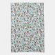 Niedliche Weihnachtsferrtchen in Weihnachtsmannmützen mit Süßspeisen und Lichtern auf blauem Hintergrund mit verstreuten Ornamenten Ferienküche Handtücher.
