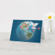 Die weiße weiße Weihnachtstaube mit einem Friedensschild auf einer rot-weiß gestreiften Kette auf einem Weltkugel. Der blaue Hintergrund kann geändert werden.