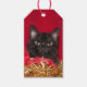 Schwarze rauchkätzende Katzengesicht auf einem roten Hintergrund und eingebettet in Weihnachtsverpackungspapier und Katzenkatze Liebhaber Weihnachtsgeschenk-Tag