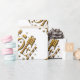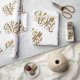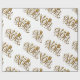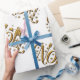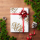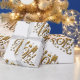 Eine elegante, weiße und goldene Weihnachtsverpackung mit dem traditionellen Weihnachtsgrüßen von Weihnachten, in Gold. In der Schrift sind auch kleine Weihnachtsbilder eingebettet, darunter Weihnachtsmannmütze, Zuckerrohr, Geschenkboxen, Goldsterne und Schneeflocken für ein festliches Ambiente.