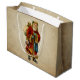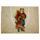 Eine Geschenktasche mit einem Vintagen Weihnachtsmann der Alten Welt. Klassische alte Welt santa, mit seinem berühmten roten Mantel und einer Tasche voller Spielzeuge. Dieser altmodische Weihnachtsmann ist schlank und hält einen Gehstock, um durch das Land zu reisen und allen Mädchen und Jungen Spielzeuge zu schenken. Alter Pergamentstil.