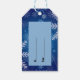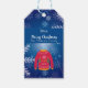 Ein Geschenktag für Ihre Weihnachtsfavoriten und -geschenke. vorne: Ein blauer Hintergrund mit großen weißen Schneeflocken, Kristallen. Die Dekoration ist mit einem üppig roten, weißen, orangen und grünen Weihnachtspulli verziert. Personalisieren und fügen Sie Ihren Familiennamen und das Jahr hinzu. Der Text: Frohe Weihnachten ist in Weiß geschrieben mit einem modernen handgeschriebenen Stil Skript. Weiße Buchstaben. Zurück: blauer Hintergrund mit Schneeflocken, ein hellblauer Rahmen mit Platz zum Schreiben per Hand.