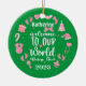Weihnachten Herzlich willkommen in unserem Welt Baby Girl Personalisierte Ornament Hübsch Grün Hintergrund mit rosa Glitzer. Briefe gemacht in weißer und niedlich rosa Mädchen Designs rund um das Ornament. Zurück ist grün mit rosa Glitzer. Der Name ist mit dem Zazzles-Designer-Tool leicht personalisiert.