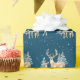 Aquarell mit Kiefernbäumen auf blauem Hintergrund mit Schneeflocken Die Hintergrundfarbe kann geändert werden.