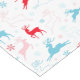 Weihnachtstischläufer mit blauen, roten und rosafarbenen Hirschmustern auf weißem Hintergrund mit fröhlichen nordischen Vibes. Kate Eden Art