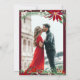 Eine schicke und moderne grüne, rote Weihnachtsfeiereinladung mit einer hübschen handbemalten roten Poinsettia, grünen Ästen mit weißem Schnee, fügen Ihr Paar Foto auf der Rückseite mit einem modernen geometrischen Rahmen auf tiefrotem bordeauxfarbenem Hintergrund. Alle Textfarben können bearbeitet werden.