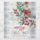 Ein rustikaler Weihnachtszweig in üppigen Rottönen und Grüntönen auf hellem Holzfußboden, für Feiertagsweinetiketten für Ihr Party oder zum Gießen.