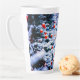 Sparrow und eine Taube vom Vogelfeeder im Winter. Schneebedeckte Weihnachtsbäume, die mit roten, blauen Kugeln geschmückt sind. Weihnachtsdylle. Einmalige, wunderschöne Latte-Tasse. Sie können dieses Design auf eine große Vielfalt anderer Produkte übertragen, wählen Sie einfach ein Produkt aus einer Reihe unten. Viel Spaß und glücklich sein!