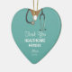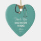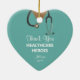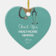 Zeigen Sie Ihre Wertschätzung an einen Covid Frontline-Mitarbeiter mit diesem Healthcare Weihnachten Vielen Dank Helden Aquamarine Custom Keramik Ornament. Es ist beidseitig mit einem aquamarinen, anpassbaren pastellfarbenen Hintergrund ausgelegt. Ein Stethoskop liegt um den Halsbereich herum. Der Text lautet "Vielen Dank für Helden im Gesundheitswesen", gefolgt von Namen und individuellem Jahr. KLICKEN SIE AUF VORLAGENOPTION PERSONALISIEREN UND GEBEN SIE NAMEN UND JAHR EIN.