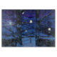 Eine Winternacht mit Blick auf ein Tor, flankiert von zwei Bäumen in einer schneebedeckten Gletscher zwischen felsigen Hügeln, gefüllt mit kleinen Bauernhöfen, Hecken und Steinmauern. Ein warmes Licht scheint von vielen Fenstern, Weihnachtslichter funkeln auf Bäumen und Zäunen, und ein Weihnachtsstern Balken aus dem Dach eines Herrenhauses, alles unter den Strahlen eines Vollmonds.