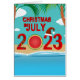 Weihnachten im Juli 2023 Illustration mit rotem fett Jahr Nummer 2023 dekoriert mit farbenfroher Lichtkette, geschnitten Wassermelone und einem roten Weihnachtshut. Am Strand mit Palmen und Meerwasser.