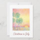 Weihnachten im Juli Grußkarte mit einem Skript-Typografie und tropischen Strand-Design mit Palmen bei Sonnenuntergang. Mit rot anpassbaren Buchstaben können Sie Ihre eigenen Informationen hinzufügen. Eine festliche Art, Urlaubswünsche an Liebende zu senden.
