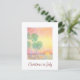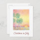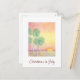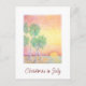 Weihnachten im Juli Grußkarte mit einem Skript-Typografie und tropischen Strand-Design mit Palmen bei Sonnenuntergang. Mit rot anpassbaren Buchstaben können Sie Ihre eigenen Informationen hinzufügen. Ein festlicher Weg, um den Sommerurlaub zu versenden, wünscht den Lieben.