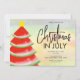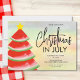 Weihnachten in der Juli-Party Einladung ist mit einem Aquarellbaum verziert Weihnachten auf einem farbenfrohen Hintergrund. Einfach anpassbar. Original Wasserfarbe © Michele Davies.