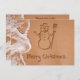 Sonnige Weihnachtsillustrierung mit einem Schneemann und frohe Weihnachten geschrieben im Sand am Strand neben dem Ozean.