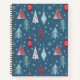 Weihnachten im Winter. Stilisierte rote, grüne Weihnachtsbäume, Weihnachtsbällchen auf blauem Hintergrund.