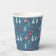 Weihnachten im Winter. Stilisierte rote, grüne Weihnachtsbäume, Weihnachtsbällchen auf blauem Hintergrund.