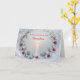 In liebevoller Erinnerung an eine verstorbene Tochter. Eine Kerze mit Flamme, ein Kranz mit Poinsettien und innen kümmernd Wörtern.