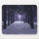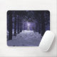 Ein glitzernder Weihnachtsbaum in einem schneebedeckten Kiefernwald am Abend des Winters.