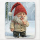 In einem schneebedeckten Wald genießt ein skurriler Gnome mit einem roten Hut in Schneeflocken einen Bonbonstock.