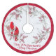 Dieser Weihnachtsbaumrock weist zwei rote Kardinäle auf, die auf verschneiten Ästen sitzen und voller Beeren sind. Der Hintergrund ist weiß mit rotem, kreisförmigem Rand. Der Familienname ist individuell einstellbar, sowie der Feiertagsgruß "Frohe Weihnachten".