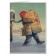 Vintage Illustration Frohe Weihnachtsbilder mit einem kleinen Jungen, der ein Paket mit Weihnachtsgeschenken und Geschenken aus dem Briefkasten durch den Schnee im Winter trägt. Der Junge trägt einen roten Hut und einen grünen Schal.