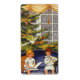 Vintage Abbildung Viktorianisches Weihnachtsbild mit glücklichen Geschwistern auf einem Sofa. Ein Bruder und eine Schwester auf einem Sofa haben einen dekorierten Weihnachtsbaum und ein Fenster hinter ihnen. Das Mädchen liest ein Buch, und der Junge isst einen Bonbons. Im Text steht "Frohe Weihnachten".