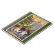 Vintage Abbildung Viktorianisches Weihnachtsbild mit glücklichen Geschwistern auf einem Sofa. Ein Bruder und eine Schwester auf einem Sofa haben einen dekorierten Weihnachtsbaum und ein Fenster hinter ihnen. Das Mädchen liest ein Buch, und der Junge isst einen Bonbons. Im Text steht "Frohe Weihnachten".