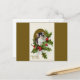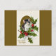 Eine graue und weiße Weihnachtskätzchen ist goldgelb mit Heiligen und Beeren gerahmt. Nachricht: Weihnachtsgrüße. Bild einer Vintagen Postkarte Grafik auf einem benutzerdefinierten goldenen Hintergrund.