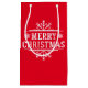 Diese Geschenktüte wird mit einem festlichen Schneeflockenprint gezeigt. Die Farbe der Beutel ist rot Passen Sie dieses Objekt an oder kaufen Sie, wie es ist.