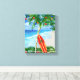 Herzlich willkommen an den warmen Sandstränden Ihres Lieblings-tropischen Inselstrands. Palmenbaum mit Weihnachtsschmuck und Lichtern, mit einem Retro-Surfbrett, das an den Weihnachtsbaum lehnt.