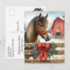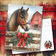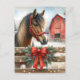 Personalisierte Weihnachtspostkarte. Ein hübsches braunes Pferd, das vor einer rustikalen roten Scheune hinter einem Zaun mit Weihnachtsbeleuchtung und einem roten Bogen stehend ist.