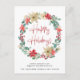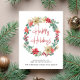 Firmenweihnachtskarte für Ihr Unternehmen oder Ihre Organisation mit einem Aquarellkranz einer roten und weißen Poinsettia Blumenblüten und Eukalyptus und saisonaler Vegetation. "Happy Holidays" ist in einem zeitgenössischen roten Drehbuch geschrieben und Sie können ein glückliches neues Jahr oder einen anderen Gruß und den Namen Ihres Unternehmens unter der einfachen modernen Typografie personalisieren. Fügen Sie auf der Rückseite eine zusätzliche Nachricht über die Kundenzufriedenheit und Ihr Firmenlogo hinzu.