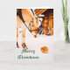 Ein hellbraun gefärbtes Pferd beugt sich dem Kopf zu einem Kaninchen auf dem Boden. Als wären sie Freunde und würden miteinander reden. Ein Bauernhof im Winter mit Schnee. Hauptfarben: weiß und braun. Foto mit Farbeffekt hinzugefügt. Grüne Buchstaben und der Text: Frohe Weihnachten. Platz, an dem Sie per Hand in die Karte schreiben können. Matching Weihnachten Grußkarten: