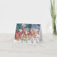 Farbenfrohe Weihnachtskarte mit Weihnachtsmann und Pferden auf Schlitten.