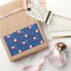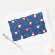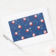 Nahtloses Muster mit dem Weihnachtsmann und Schneeflocken auf blauem Hintergrund, Cartoon Stil. Die Santas sind chubby, mit weißen Bärten und roten Anzügen mit schwarzen Gürteln. Die Schneeflocken sind in verschiedenen Formen und Farben erhältlich, darunter weiß, blau und orange. Das Wort "Frohe Weihnachten" ist in kleinen Buchstaben im ganzen Muster verstreut. Das Muster ist festlich und fröhlich, perfekt für die Ferienzeit. Digitale Kunst.