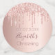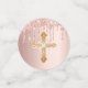 Eine Rose goldener Hintergrund mit Imitaten Rose Gold Glitzer Tropfen. Personalisieren und Hinzufügen eines Datums und Namens/Ereignisses. Dunkle Rose goldfarbene Buchstaben. Einige Konfetti-Chips mit Namen und Datum, andere mit einem Kreuz. Fügen Sie Ihr eigenes Foto auf zwei der Chips.