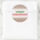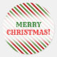 Dieses runde Weihnachtsaufkleber-Design weist ein Muster aus roten, weißen und grünen Streifen auf. Diese Farben sind gewöhnlich mit Weihnachten assoziiert. Es enthält auch den herzlichen Gruß "MERRY CHRISTMAS!", in rot und grün gefärbter Text. [~Z0000114]