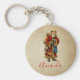 Ein Schlüsselanhänger mit einem Vintagen Weihnachtsmann aus der Alten Welt. Klassische alte Welt santa, mit seinem berühmten roten Mantel und einer Tasche voller Spielzeuge. Dieser altmodische Weihnachtsmann ist schlank und hält einen Gehstock, um durch das Land zu reisen und allen Mädchen und Jungen Spielzeuge zu schenken. Alter Pergamentstil.