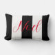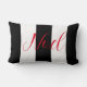 Dieses Lumbalkissen im Urlaubssaal enthält das Wort "Weihnachten" in rotem Schriftzeichen auf einem Muster schwarz-weißer vertikaler Streifen.