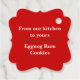 Dieses extravagante Geschenketikett in fett roten und grünen Farben mit weißem Schriftzeichen und einer weißen Schneeflocke in der Mitte. Personalisieren Sie dies mit Ihrem eigenen Urlaubsgruß und Namen. Auf der Rückseite ist es rot mit weißem Schreiben und Sprichwort "von unserer Küche zu Ihrer" dann eine Zeile und den Namen des Geschenks, das Sie geben. Diese Tags wären gut für Kochgeschirr für den Austausch von Weihnachtsgebäck oder für das Umwickeln von Marmeladen und Gelee-Gläsern.
